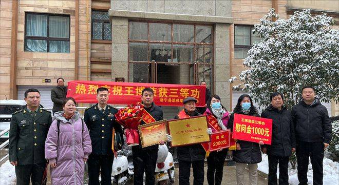 1月19日,火箭军某部徐指导员、洛宁县人武部、洛宁县退役军人事务局、小界乡事务工作站以及相关的工作人员一行,到公园壹号现役军人王博家中,为其送上三等功喜报。