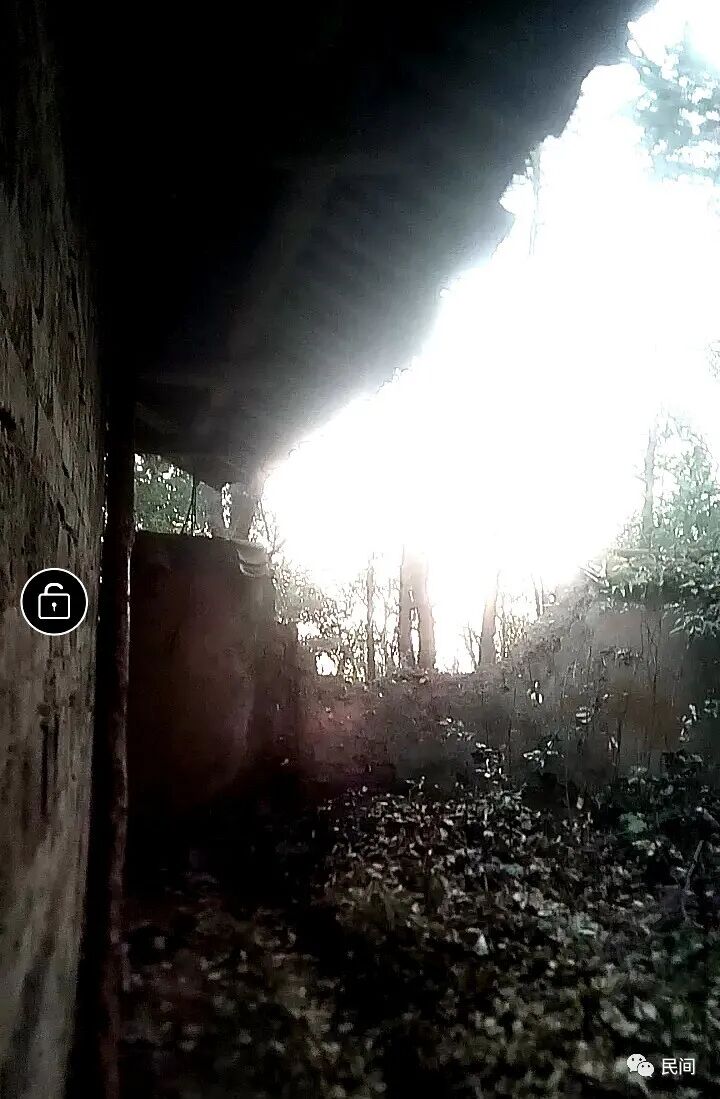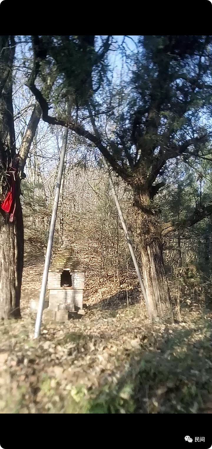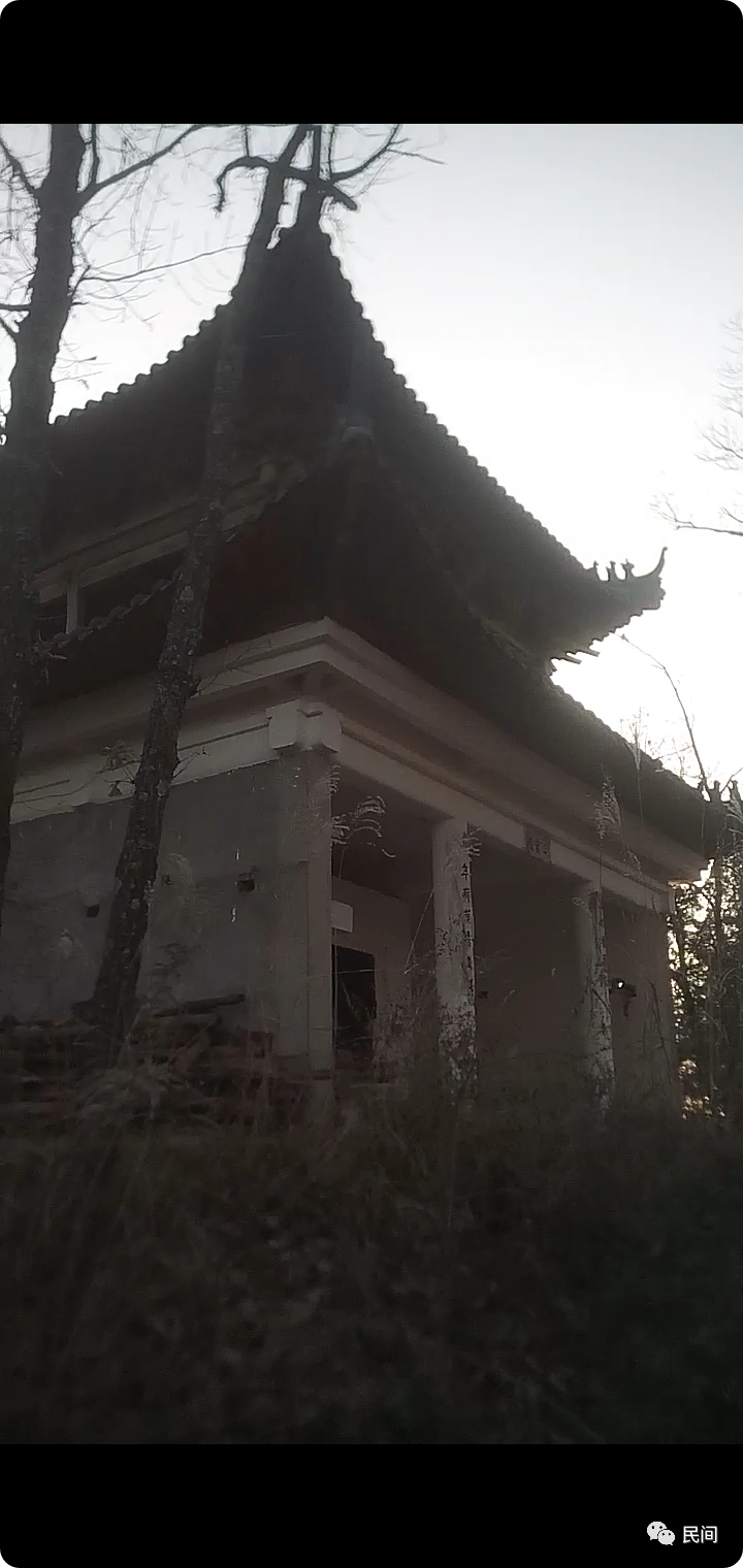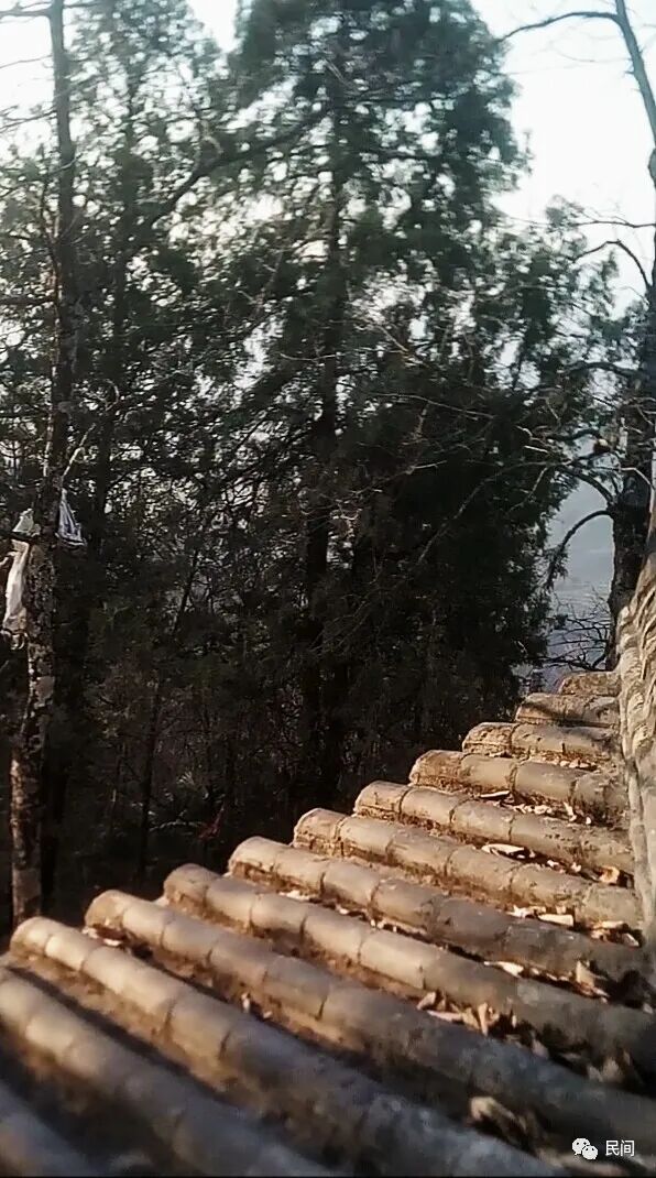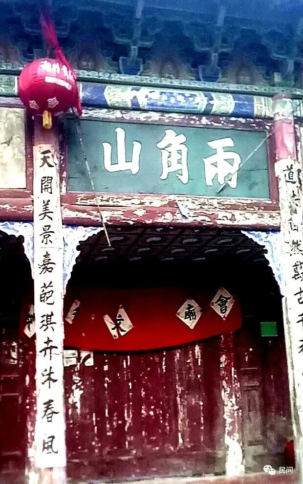 我们对着门内作揖鞠躬三次以示礼拜,之后又从屋旁的小路继续前行。二十多米后来到一处门前稍觉宽敞处,场边高大的古树遮护,尤为巨者,大约三四棵之多,形态各异,均粗有两围,树冠如擎天大伞,其荫敝之处几丈有余。山门坐北朝南,有三个门洞,入内几步方为暗红色木门三幅。三个门洞正上中间一块黑底白字,赫然写着的“两角山”,每个字斗大,端庄大气。其上为斗拱托起飞檐屋顶。山门两侧为厢房之土坯南墙。原以为会有看庙的人,却不想是山门紧闭。我们循山门西侧院墙垮塌处进到院内,一片萧疏破败的景象触目惊心。