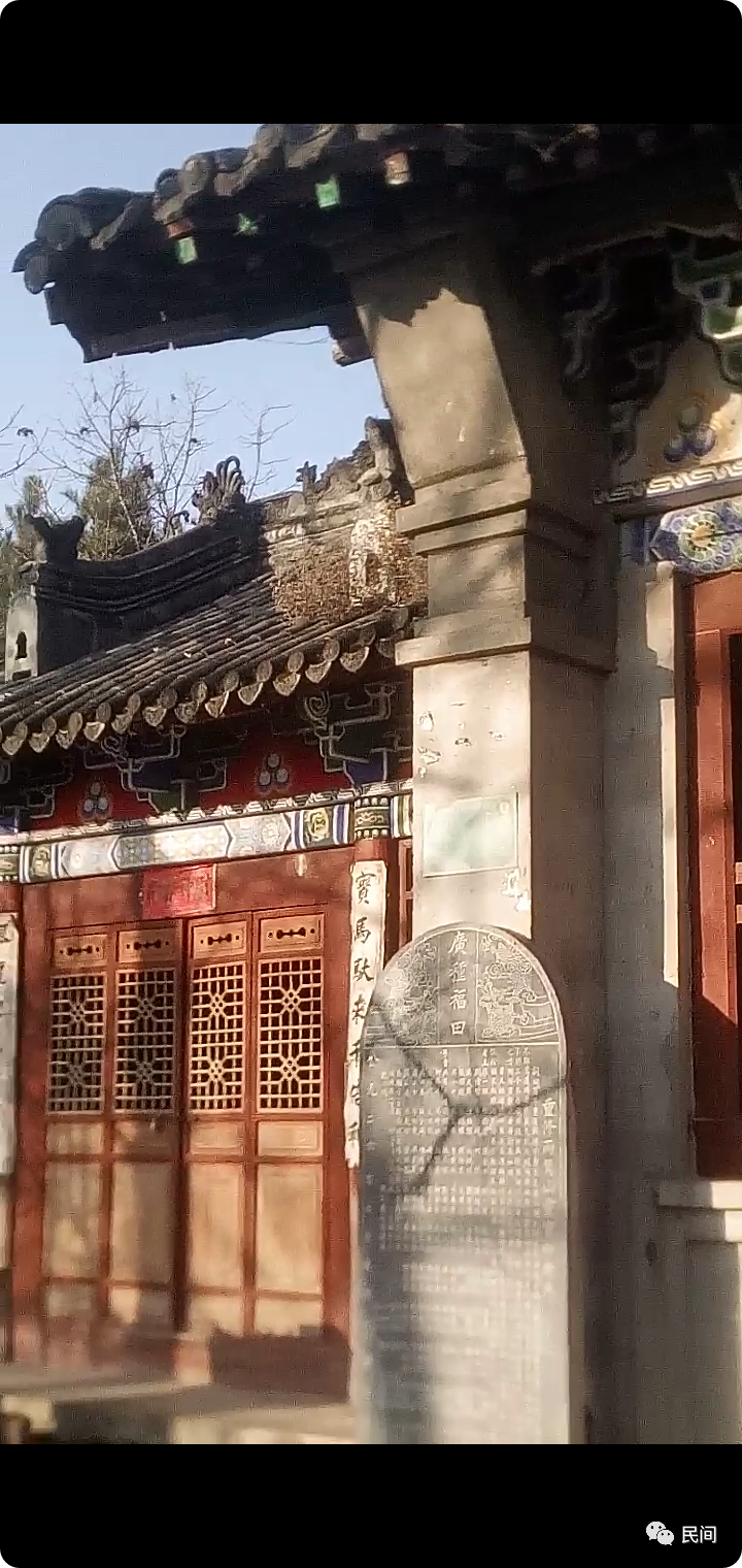 檐下东侧有功德碑叙述,斗姆为元始天尊阴炁所化,西天勾陈上宫天皇大帝,中天紫薇北极大帝及北斗七星贪狼、巨门、䘵存、廉贞、武曲、文曲、破军之母,为先天神祇,在道教中地位十分尊崇,主天下万物生长,解苦度厄。我心想,难怪这些神仙如众星捧月般簇拥着她而分列其后其左其右,原来如此这般。