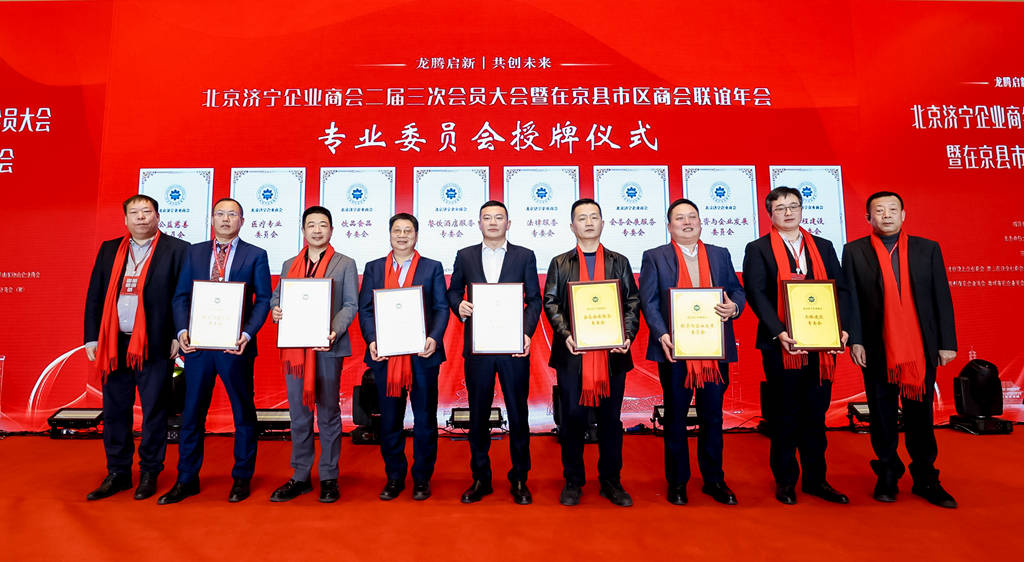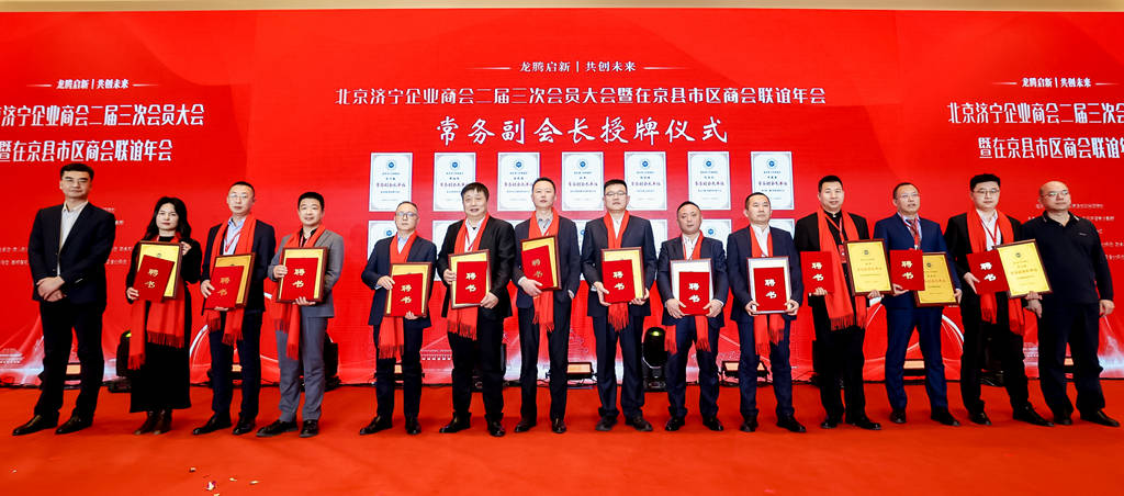 年会现场进行济宁市“双招双引”推介活动、独家冠名品牌支云酒业推介的同时,还举行了北京济宁企业商会常务副会长授牌仪式、北京济宁企业商会专业委员会授牌仪式。