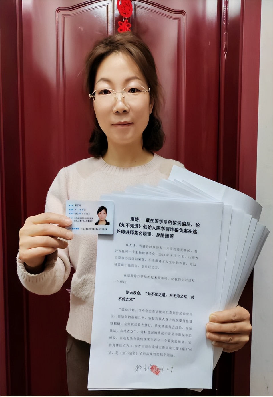 图注:外聘讲师荣强妻子郝宝玲实名举报《知不知道》 实际控制人陈学明、李飞飞夫妇