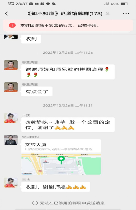 图注:李飞飞“师娘”在微信聊天群内给“馆主弟子”发送总部的定位