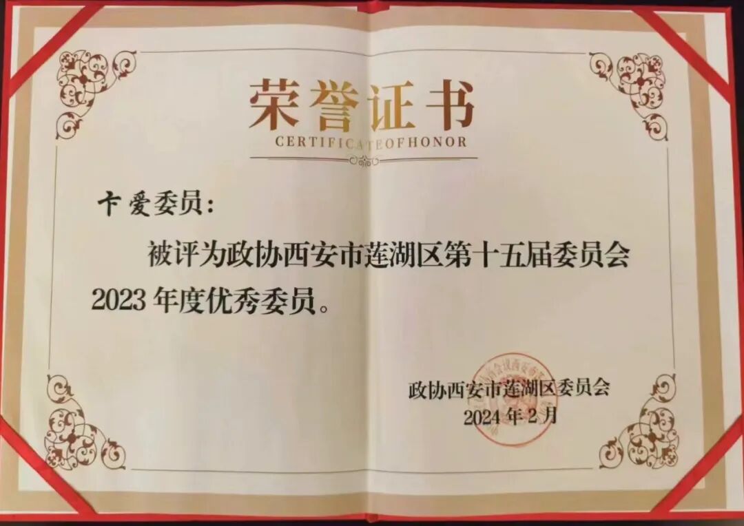 卞爱被评为政协西安市莲湖区第十五届委员会2023年度优秀委员