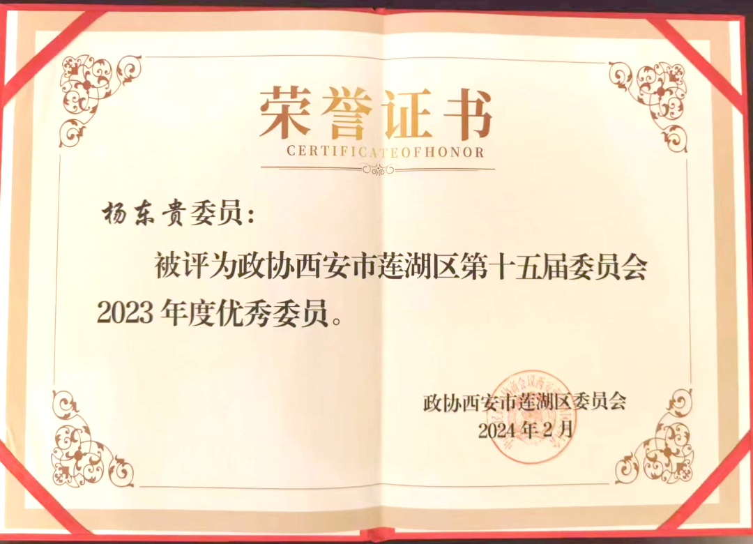 杨东贵被评为政协西安市莲湖区第十五届委员会2023年度优秀委员
