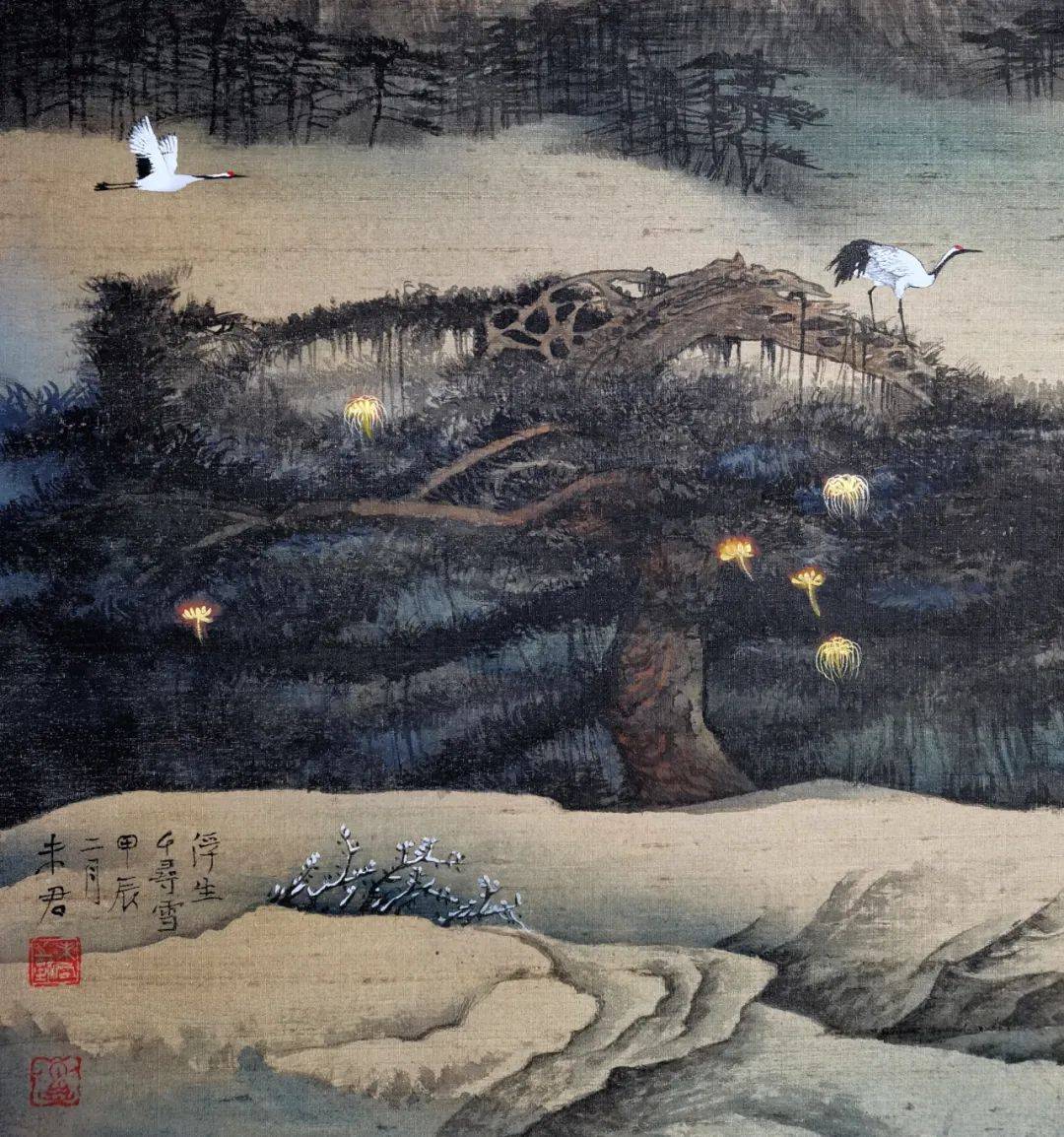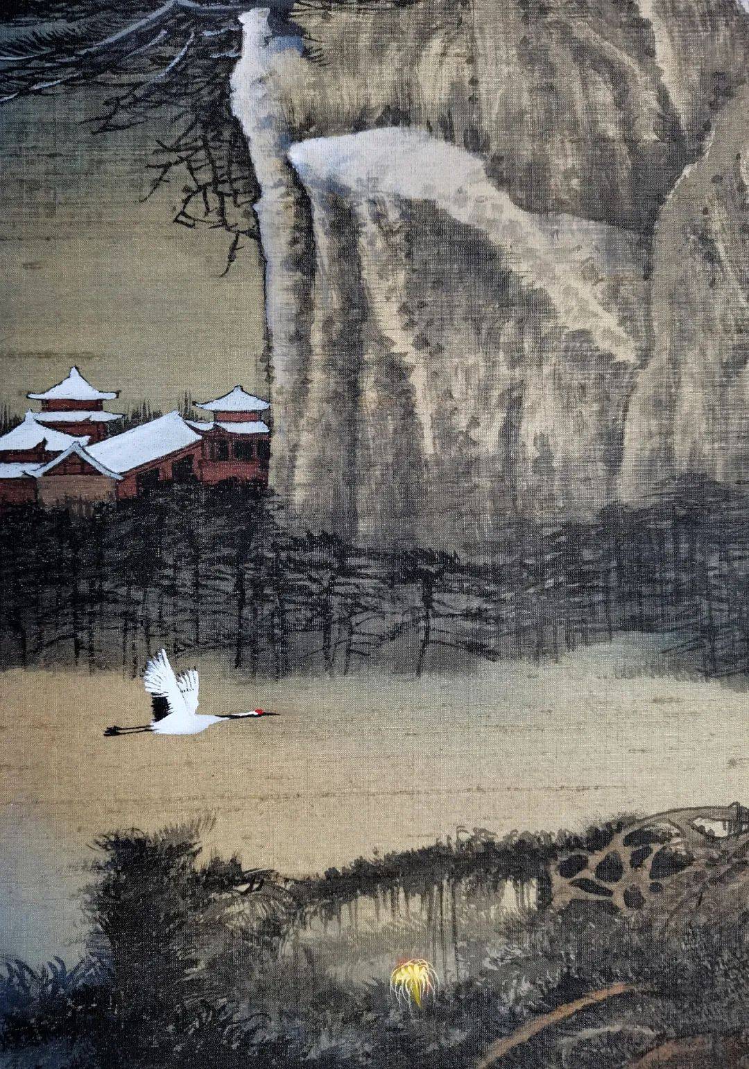 在这荒寒之地,有一只仙鹤正从远方穿越山岚而来,一身轻盈,仿佛可见其鹤鸣声声,模拟天籁,给这冰冷的山川陡增几许暖意。在古画中可见禽鸟,大多带有悲天悯人的情感色彩,使观者读起来便进入到一个幽深的环境中去。人鸟共存,那是何等的美意,这会是那尊佛家僧侣的呼唤吗?神话传说中鹤寿可至千年,古人把鹤称为一品之尊的贵鸟,仅次于凤凰。