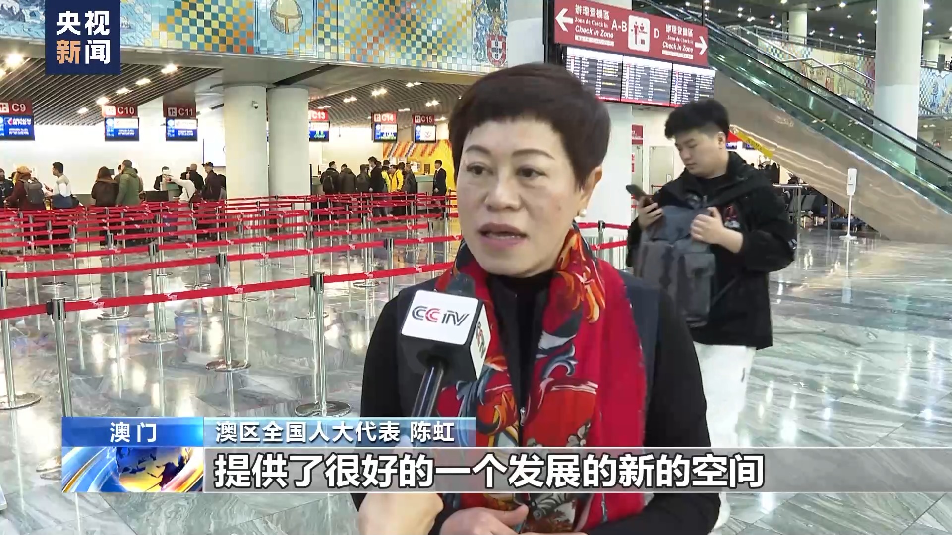澳区全国人大代表 陈虹:国家给了澳门很好的发展的机遇跟平台,提供了很好的一个发展的新的空间,特别是深合区,粤港澳大湾区,为澳门居民更好地融入国家发展大局提供了这么好的空间。