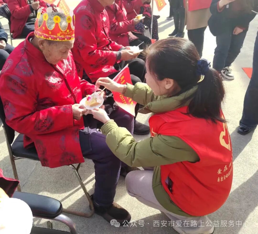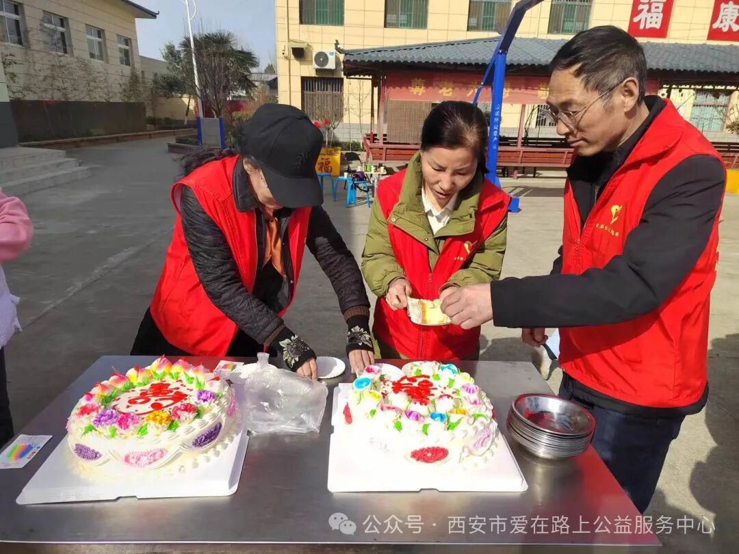 文艺演出活动中,爱在路上爱心大使金嗓子王玉梅老师为老人们演唱了《父老乡亲》《红梅赞》《牧羊曲》等老人们耳熟能详的经典老歌,爱心主持张晓刚演唱了感恩歌曲《爹和妈》,来自西安音乐学院的青年演奏家小韩为老人们带来歌曲串串烧的精彩演奏,老人们掌声不断,现场欢声笑语,中途志愿者还设定了套圈游戏和投壶活动,老人们套中自己喜欢的东西,个个开心的像孩子一样笑得合不拢嘴,现场处处洋溢着一片欢乐祥和的气氛。 集体生日活动中,志愿者们为老人们戴上生日帽,与老人围坐在一起、许愿、切蛋糕,“老寿星”们脸上都洋溢着幸福的笑脸。老人们纷纷表示,能这么多人一起过生日真的很开心,即热闹又温馨,希望志愿者们以后能经常到敬老院来。
