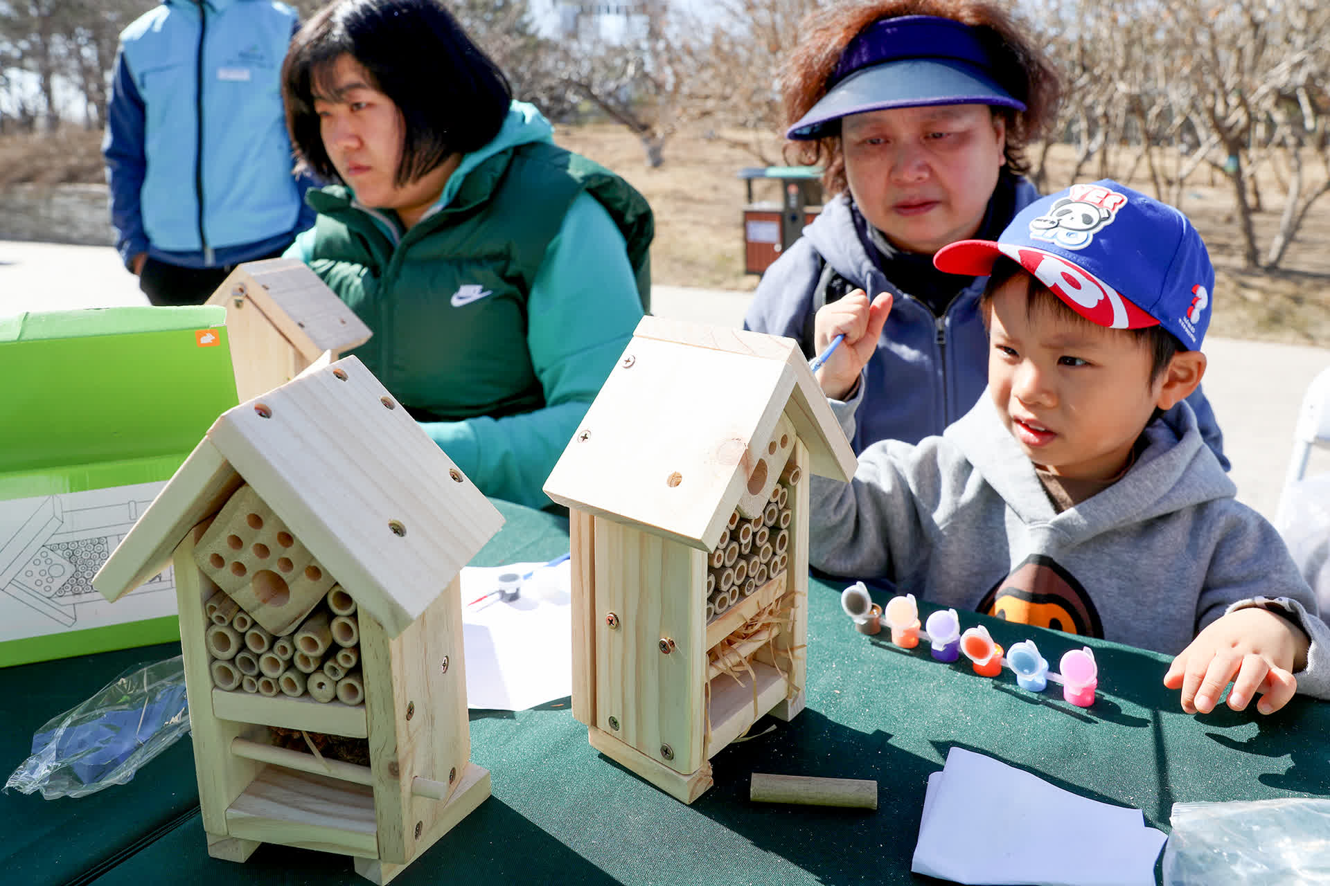 望和公园蜿蜒的园路边,还设置了宣传区、互动区和科普区。在植物拓染区,花瓣和树叶的色彩被大家亲手拓印在白色手帕上;在手工制作区,几位市民制作的鸟巢、昆虫旅馆,将成为小动物的温暖家园。