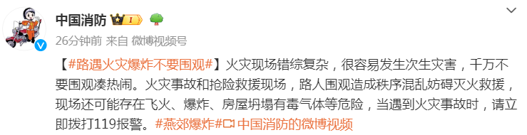 火灾现场错综复杂,很容易发生次生灾害,千万不要围观凑热闹。火灾事故和抢险救援现场,路人围观造成秩序混乱妨碍灭火救援,现场还可能存在飞火、爆炸、房屋坍塌有毒气体等危险,当遇到火灾事故时,请立即拨打119报警。