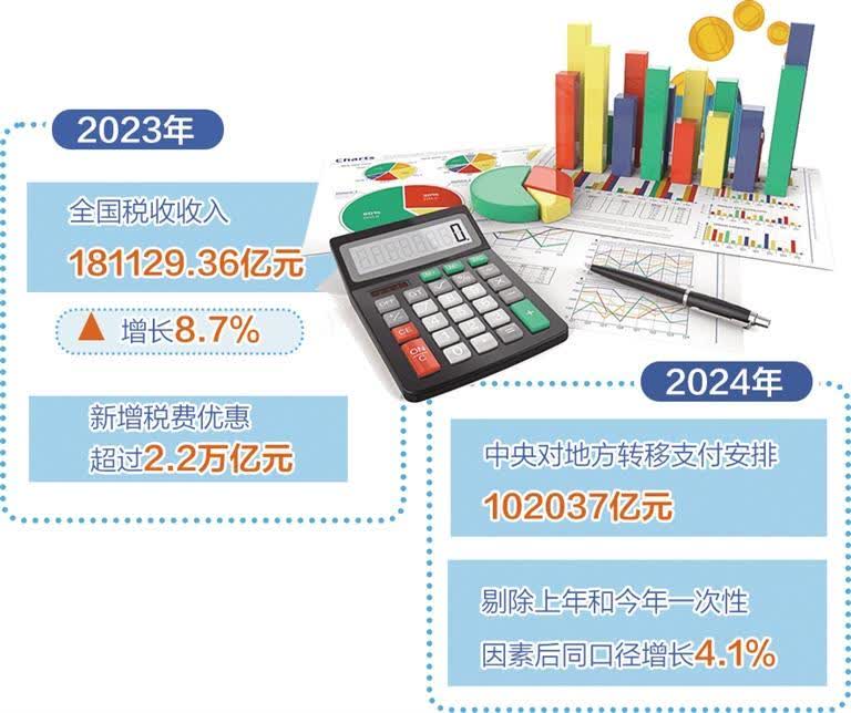 统计显示,去年全国一般公共预算收入216784.37亿元,比2022年增长6.4%。其中,税收收入181129.36亿元,增长8.7%。同时,通过延续优化完善一系列税费优惠政策,去年新增税费优惠超过2.2万亿元。