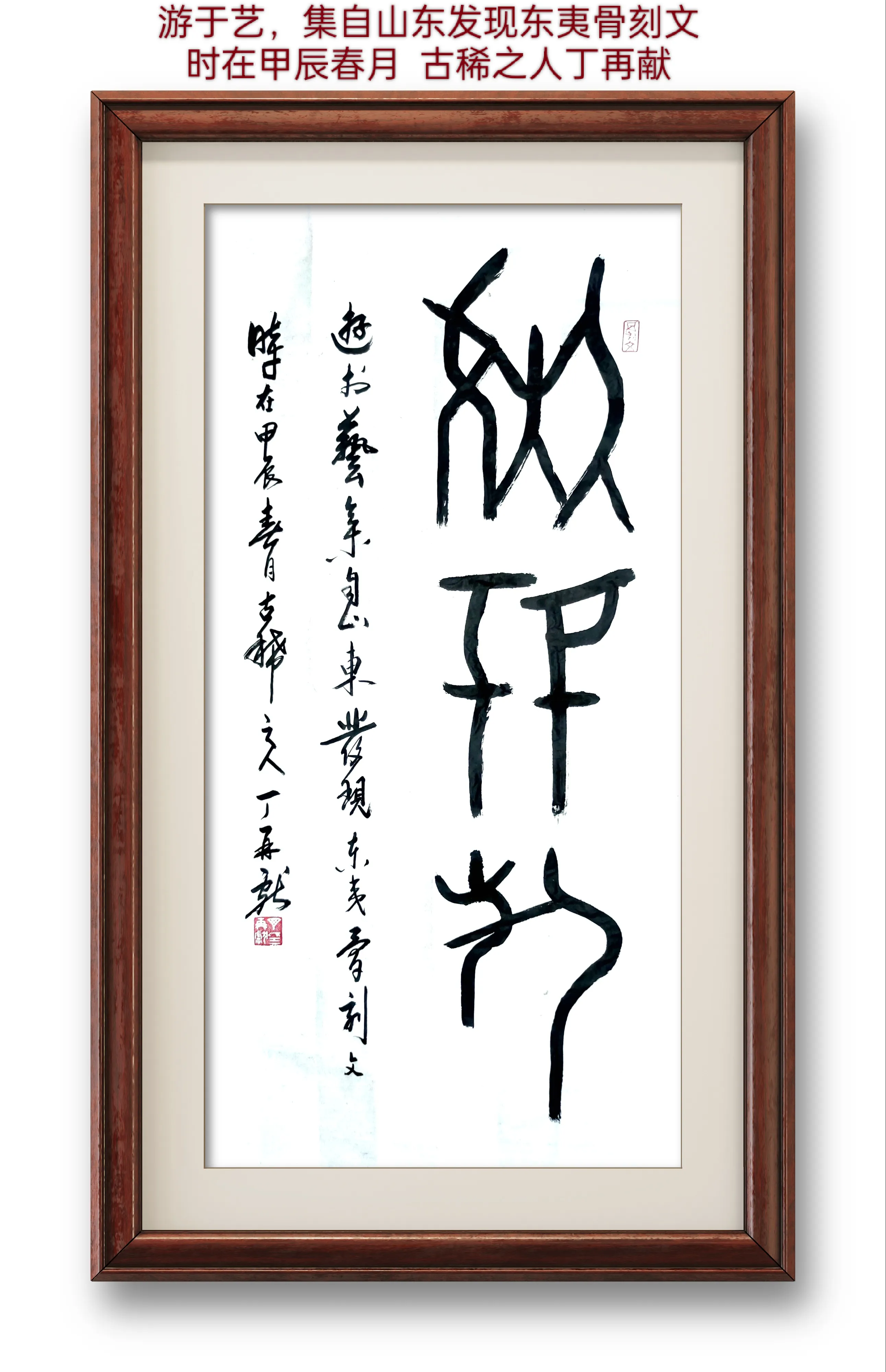 东夷骨刻文,到目前为止是中国最古老的文字,丁老先生与其家兄丁再斌破译出了900多个比甲骨文早1300多年的东夷骨刻文,并集字创作成格律诗词、楹联或名言佳句,再以书法艺术的形式表达出来,形成了集破译、诗词和骨刻文书法艺术于一体的独特风格。