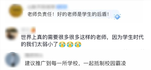 这位老师的做法,赢得了众多网友的点赞:“好老师是学生的后盾”“一起抵制校园霸凌”。