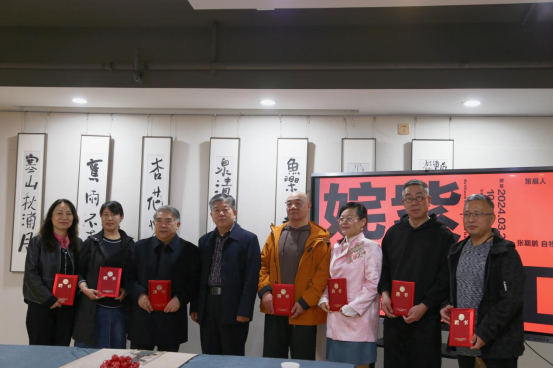 开幕式后,垂杨书画院举行了第五批特邀顾问、特聘艺术家聘任仪式,聘请济南市历城区90高龄的老书画家贾祯瓒先生为特聘顾问,聘任省内外45位书画家为特聘艺术家。垂杨书画院秘书长杨文学宣读了特邀顾问、特聘艺术家名单,自牧院长向到场的特聘艺术家梁安民、张健蕾、宫晓燕、郭明良、田静、王子勇、吕钊旭颁发了聘书。