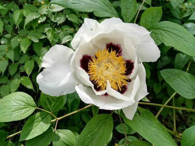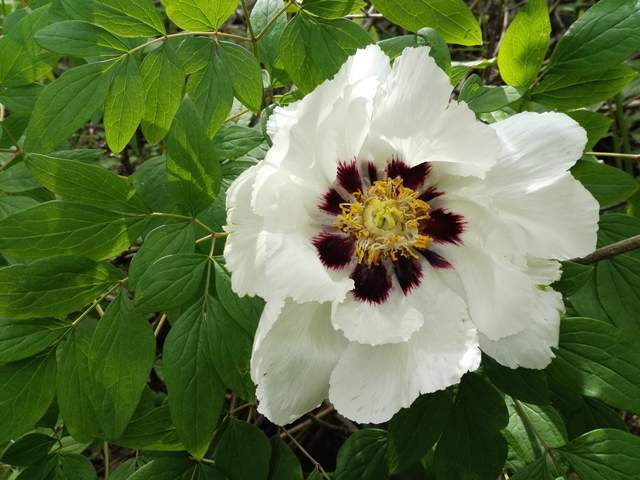 2020年“五一”节,天气晴朗,气温32℃,我和花友相约欣赏开花的野生紫斑牡丹。在洛宁山区,离野生紫斑牡丹30米左右已闻到牡丹独有的香味,然后成功找到开花的野生紫斑牡丹。该处野生紫斑牡丹仅剩余16株,生境没有变化,牡丹生长不旺盛,仅6朵花,其中1朵已谢,3朵正开,2朵花蕾。花单瓣,2轮,白色,基部有明显紫斑,其中1朵斑点泛红;花径10-13厘米,花瓣10-13枚,花蕊黄色多数,花丝白色,其中1朵花丝泛紫;心皮白色,柱头乳黄色;香气浓郁;二回至三回羽状复叶,小叶15-25枚,全缘,偶有缺刻;有前一年残存蓇葖果和种子。仔细观察,野生紫斑牡丹有整株死亡和部分枝条枯死现象。当地“十年九旱”,2020年春季旱象较重,山地有裂缝,干旱应该是牡丹枯死的主要原因。这次,花友终于相信洛宁山区的野生牡丹是紫斑牡丹。