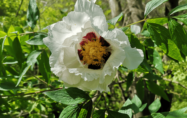 2005年“五一”节,我听洛宁县当地群众说山里有野生牡丹,在向导带领下,在洛宁县山区找到了野生紫斑牡丹(Paeonia rockii subsp. rockii D.Y.Hong)原亚种,或称全缘叶亚种、洛克牡丹。野生紫斑牡丹生长在阴坡山下,海拔900米左右,株龄15年左右,高1至2米,当时牡丹正开花,仅发现4株,单朵花花瓣10枚,基部有明显紫斑。同时发现,该野生紫斑牡丹伴生有野生的毛芍药。