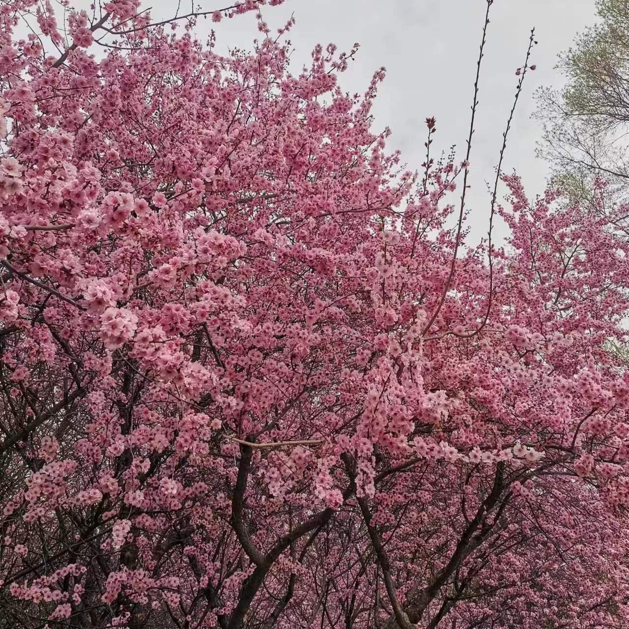 我们继续往前走,走到了公园的东门口,东门口热闹非凡,东门口左边是几棵矮矮的深粉红色的樱花树,正值花期旺季,花开得灿烂无比,大人孩子争相留影拍照,花映红了人们的笑脸。