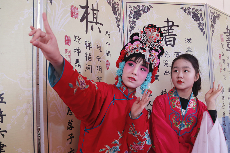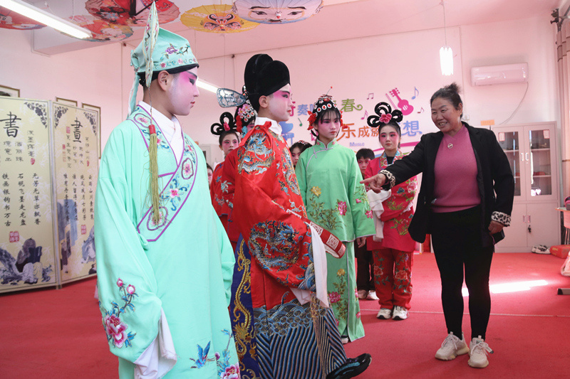 国家级非物质文化遗产“青县哈哈腔”协会的老师教学生们戏曲台步。邢磊 摄