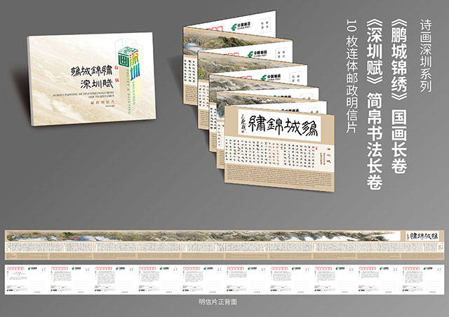 近日,深圳邮政发行了一套10枚连体的“鹏城锦绣图、深圳赋”邮政明信片,内含中国画长卷、赋、书法和英文翻译,它可以让国内外友人通过这套极具创意的文化产品明信片,领略深圳科技创新、生态风光和建设新成就。