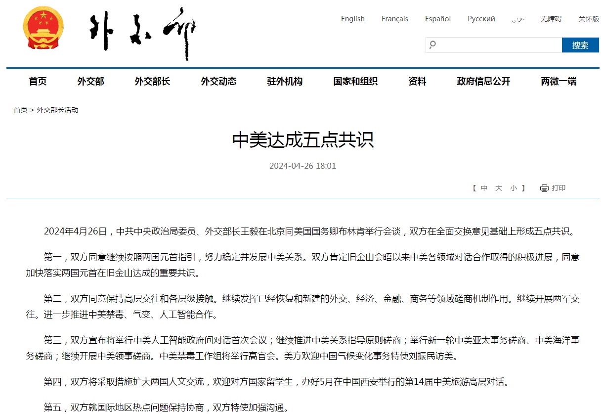 2024年4月26日,中共中央政治局委员、外交部长王毅在北京同美国国务卿布林肯举行会谈,双方在全面交换意见基础上形成五点共识。
