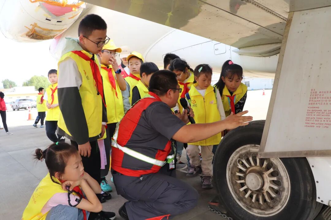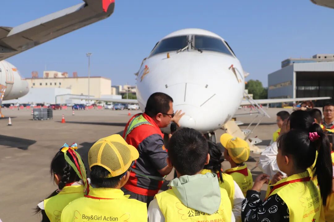 长安航空公司机务工程师郑工带领小天使们来到一架目前停用的巴西产的中型飞机前为小天使们介绍飞机的相关知识。郑工带领小天使们环绕飞机一圈,对飞机各个部分的构造进行介绍,讲解主要部件原理及功能。郑工给小天使们介绍说,机头装有雷达接收器,并让小天使们摸了一下雷达罩的外壳,感觉软软的。参观完飞机后合影留念
