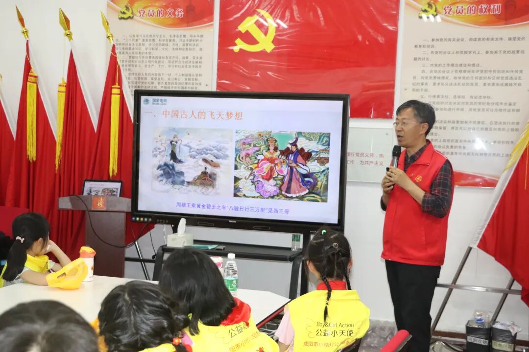 小天使王佩璇说:”古代有嫦娥奔月以及夸父追日等神话故事。“郭恩伟通过嫦娥奔月,周穆王乘黄金碧玉之车“八骏日行三万里”见西王母,西游记中的孙悟空以及众神仙,萧史乘龙、弄玉跨凤,万户自己制作火箭上天等故事为小天使们讲了古人的飞天梦想。