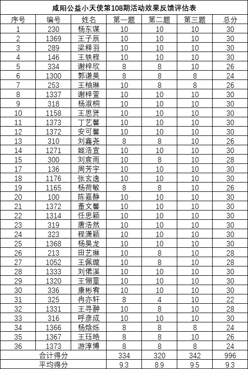 经过对收回的36份问卷进行计分统计,第一题平均打分为9.3分,第二题平均打分8.9分,第三题平均打分9.5分。平均得分9.3分,属于非常满意范畴。这次活动会在小天使们心中留下什么印象呢?看看小天使所写的成长日记吧!“咸阳公益小天使“青少年社会实践项目是咸阳市小桔灯公益服务中心的品牌项目,荣获“2023年度陕西省最佳志愿服务项目”等多项重要荣誉。项目旨在满足孩子们扩大视野增长见识的社会需求,解决应试教育和”被圈养“所带来的一系列社会问题,项目自2019年8月起开始运营,截至目前已经举办了108期社会实践活动。“爱在童年、益在未来!”咸阳公益小天使项目计划每年度举行不少于30场次的环保、文化、健康、安全、文明、爱心、科技、法制、军事、职业体验等小天使社会实践公益活动,通过体验式的参与方式,加上带队老师的启发引导,最终达到让小天使们开阔眼界、增长知识,激发学习兴趣和探索精神的目的。