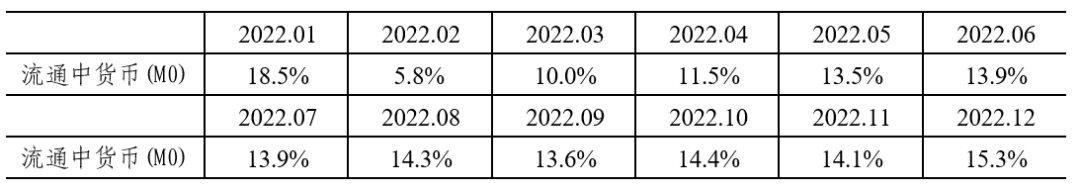 注4:自2022年12月起,“流通中货币(M0)”含流通中数字人民币。12月末流通中数字人民币余额为136.1亿元。修订后,2022年各月末M1、M2增速无明显变化。修订后M0增速如下: