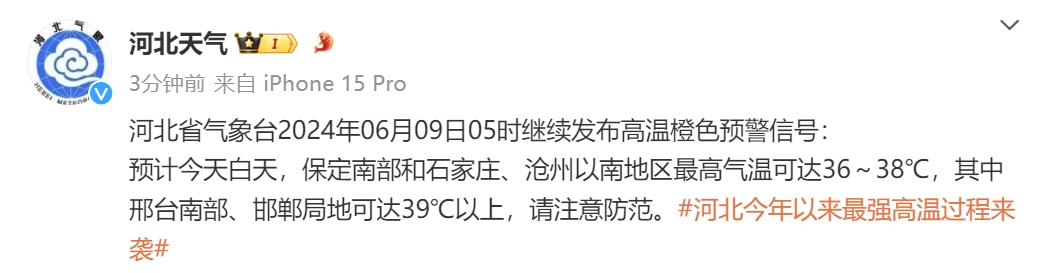 河北省气象台2024年06月09日05时继续发布高温橙色预警信号: