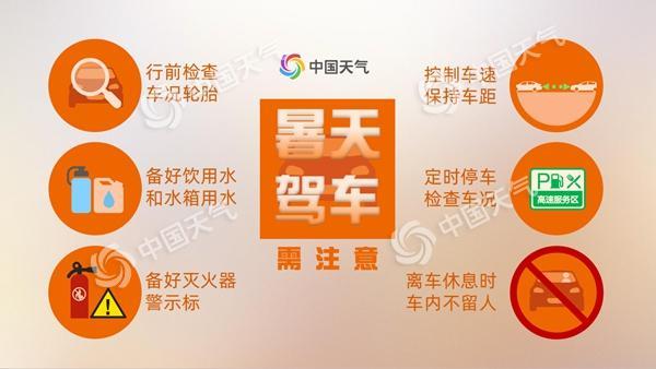 在交通出行方面,随着地表温度升高,户外行车容易发生爆胎、自燃等状况,影响行车安全。当气温≥35℃或者路面温度≥65℃时,爆胎危险性大大增加。行车前要仔细检查车况,备好灭火器、警示标,如果长时间行驶在高速公路上,应定时前往服务区休息,给轮胎降温。