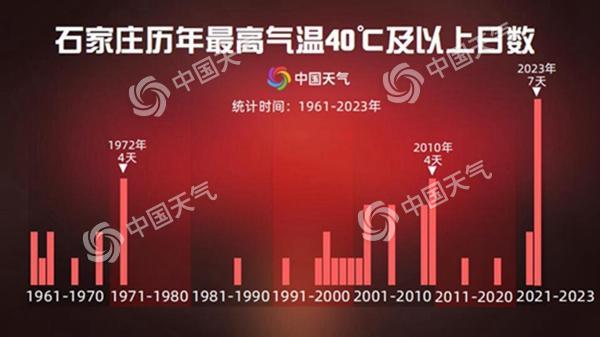 以河北石家庄为例,进入2000年以后出现40℃及以上的高温年份明显增加,其中,2010年出现40℃及以上的高温日数共4天,2023年高达7天。