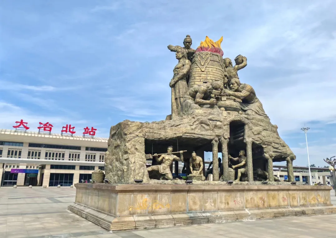 【大冶北站前的雕塑,正反映先民冶炼主题/摄自王千马】