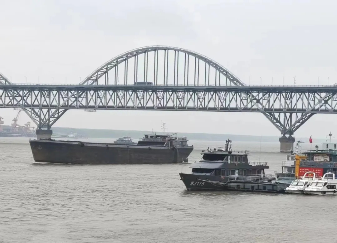 【九江浔阳楼旁长江江面,头上有一桥飞架南北,桥下货轮往来/摄自王千马】