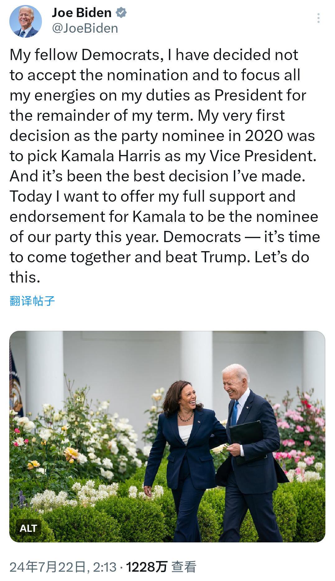我的民主党同僚们,我决定不接受总统候选人提名,将我所有的精力集中在完成我作为总统的最后任期上。作为2020年民主党提名人,我的第一个决定就是选择卡玛拉·哈里斯作为我的副总统,这是我做出的最好的决定。今天,我也要全力支持卡玛拉成为我们党今年的候选提名人。民主党人们,是时候团结起来打败特朗普了。让我们完成这一切。