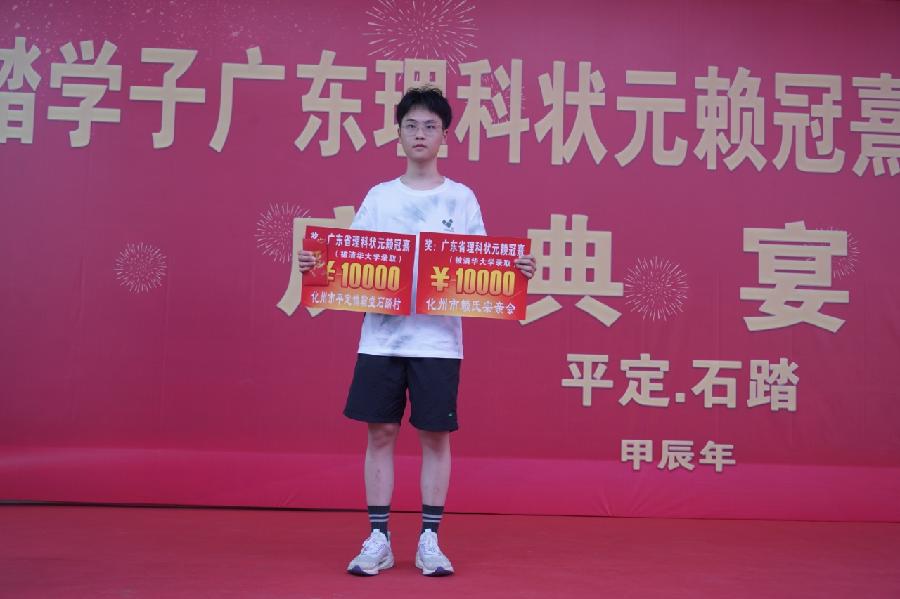 注:赖冠熹同学简介:赖冠熹,男,出生于化州市平定镇翰堂村委会石踏村,在化州市三小读小学、化州市实验中学读初中,化州市第一中学读高中,化州市第一中学附属实验学校复读。2023年高获总分677分,获全市物理类:第4名,2024年高考,总分706分,获全省物理类第一名。