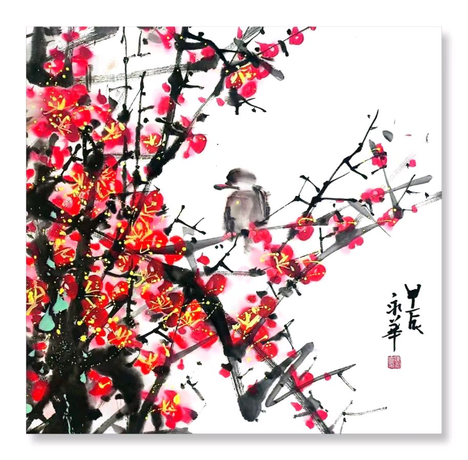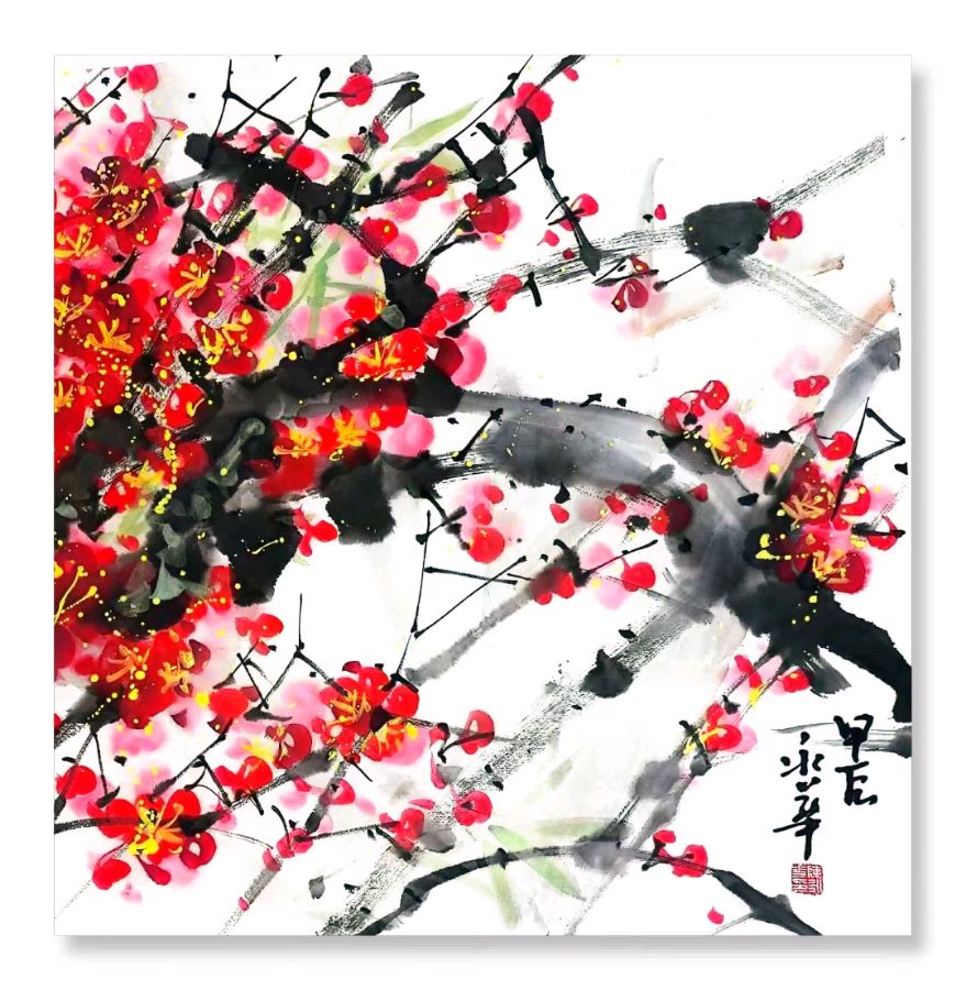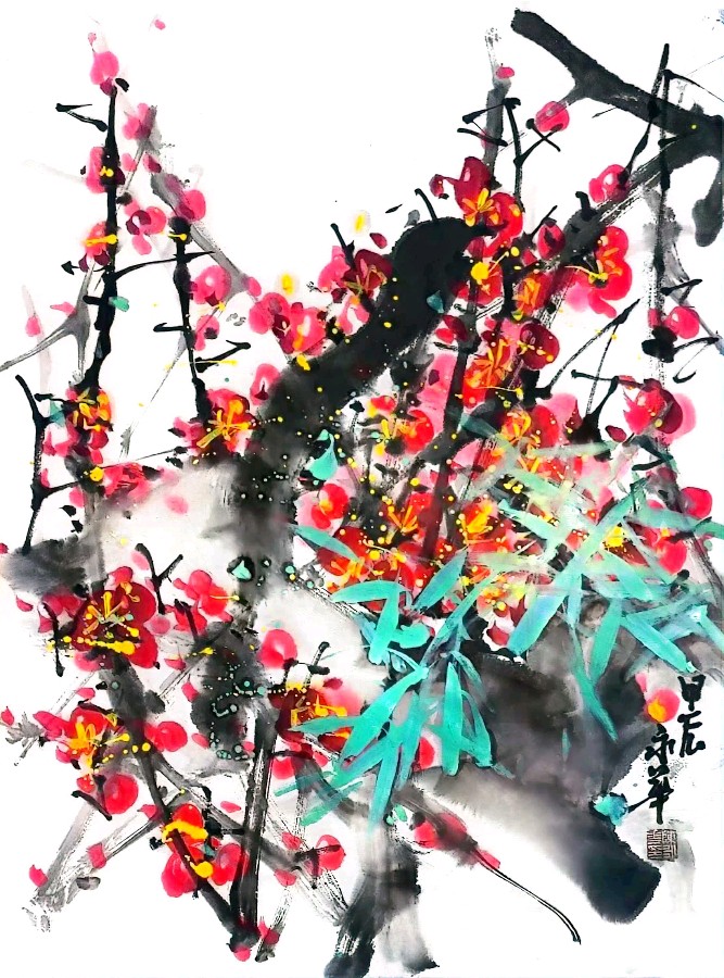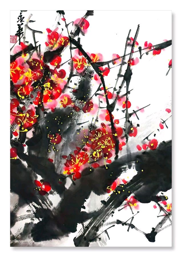 陈氏梅花,凭借其别具一格的艺术格调与深沉厚重的文化内蕴,宛如梅花绘画领域的一株奇卉。陈永华老师在传承传统梅花绘画技法的基石之上,果敢创新,将陈氏梅花塑造为一种极具特色的绘画艺术。其梅花佳作,既葆有传统的韵味风姿,又巧妙融合现代审美意趣,淋漓展现了梅花坚韧不屈、高洁脱俗的精神特质。