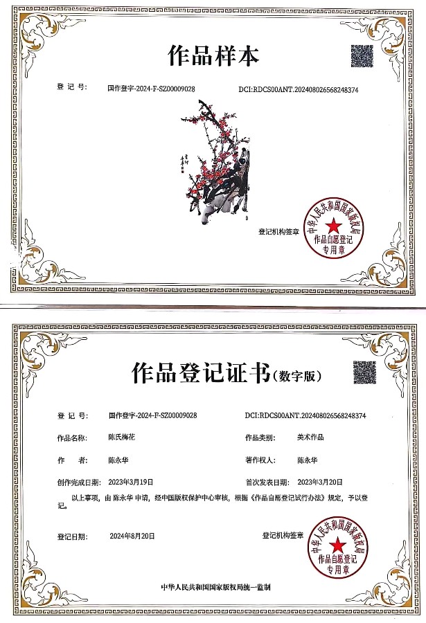 专利的成功获取,象征着陈氏梅花绘画技法已然成为我国文化艺术领域的璀璨珍宝。这不仅是对陈永华老师艺术生涯的莫大肯定,更为我国梅花绘画艺术的传承与演进注入了崭新的活力源泉。