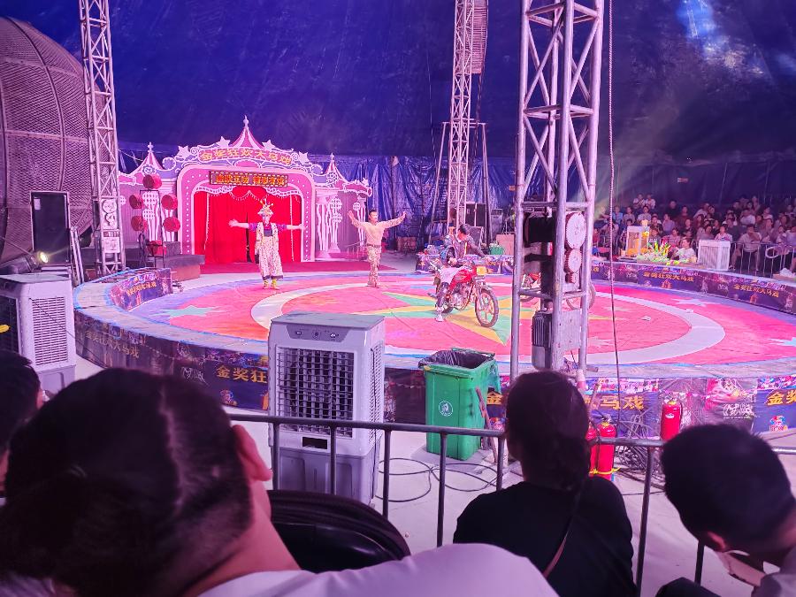 进入公园不久,我们就被一处特别的场地吸引住了——那里正在举办一场别开生面的马戏表演。随着第一束追光划破天空,落在舞台中央,我的目光也随之被紧紧锁住。那一刻,空气似乎凝固了,只听见心跳的声音在胸腔内回响。紧接着,一位身着绚丽服装的表演者如同一只展翅欲飞的凤凰,从天而降,轻盈地落在舞台之上。