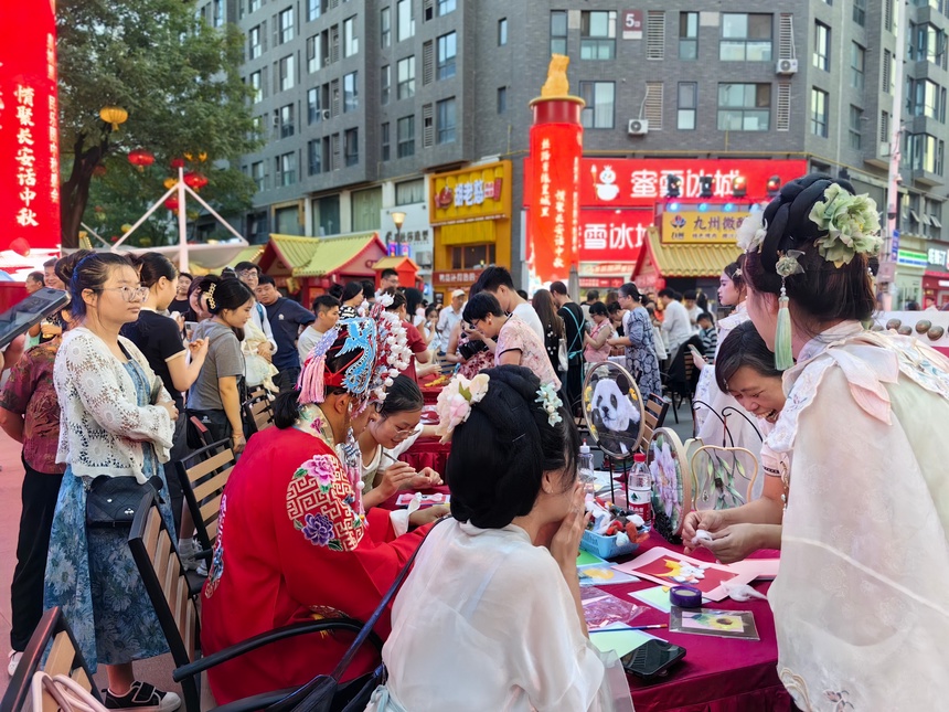 “中秋明月照,四海共团圆。”9月16日,位于陕西西安新城区的皇城里·民乐园步行街内,热闹非凡,一场独具特色的中秋文化盛宴在此绚丽开启。活动以“丝路青缘皇城里,情聚长安话中秋”为主题,吸引了众多中外青年学生参与其中,在沉浸式文化体验中,感悟中秋文化之美。