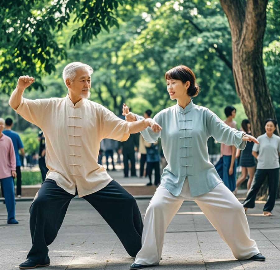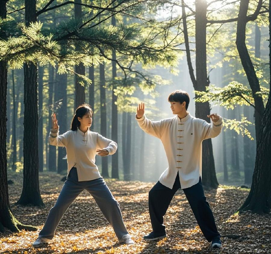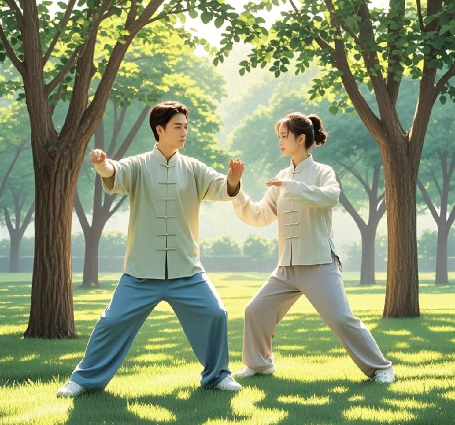 晨光微曛,阳光如轻柔薄纱,如梦如幻地笼罩着静谧清幽的公园。我与爱人身着宽松飘逸的太极服,携手缓缓步入这空灵澄澈之境,仿若穿越千年时光的雅士佳人,即将与自然和太极展开一场美妙绝伦、动人心弦的深度对话。起势之际,双手如白鸽悠然扬起,指尖轻翘,引领身心缓缓沉浸于那一片静谧祥和之中。我们轻轻吸气,将自然的清新之气缓缓纳入丹田,感受气息在体内悠然流淌,如同山间清澈见底的溪流,潺潺流淌,滋养身心的每一处角落,带来无尽生机与活力。