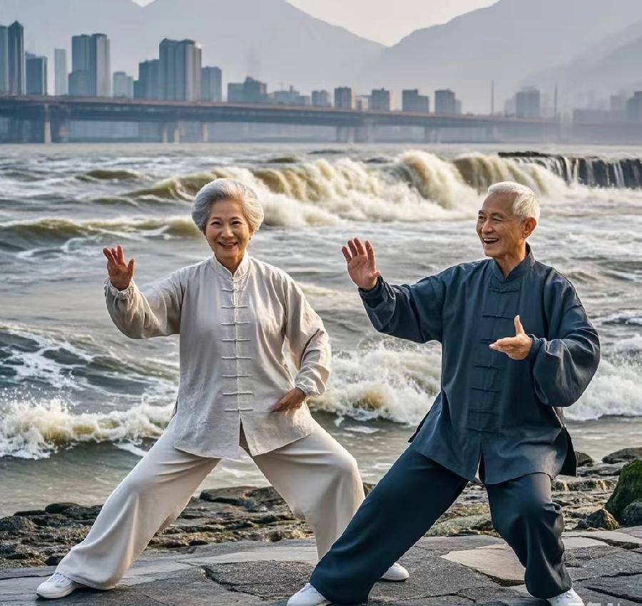 置身波澜壮阔的长江之畔,江水滔滔,奔腾不息,雄浑壮阔之景如宏伟壮丽的画卷,令人心潮澎湃,豪情万丈。面对此等壮丽之景,心中涌起豪迈之情,动作亦随之更为雄浑有力,气势磅礴。刚猛的招式在此时更显威力,如汹涌江浪中的破浪之拳,展现一往无前的强大气势。在江水的奔腾轰鸣声中,仿佛能感受到太极拳先辈们的智慧与力量在心中澎湃涌动,激励着我们不断探索前行,追求更高境界。我们竭力在自身与自然的强大力量间探寻平衡,让身心在一动一静中达至和谐完美之境。身体随江水节奏起伏波动,体悟大自然的宏伟神奇与无穷奥秘,领悟太极拳中开合虚实的变幻玄机,感受生命的律动与力量的交融,仿佛与天地万物融为一体。