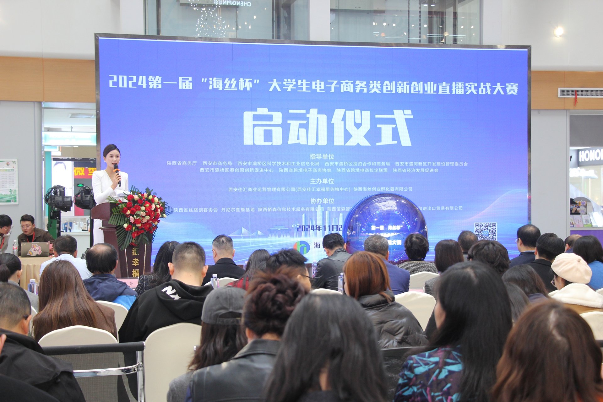 深秋时节,双十一到来之际,在千年古都的西安,在充满历史和传说的灞桥海丝创业孵化器的这片电商创业的热土上,迎来了万众瞩目的第一届海丝杯大学生电子商务创新创业直播实战大赛的启动仪式。11月2日,2024年第一届“海丝杯”大学生电子商务类创新创业直播实战大赛,在古城西安佳汇幸福里隆重开幕。