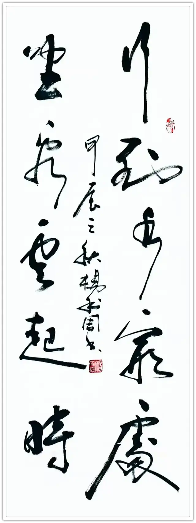 杨先生的书法初看一眼便有惊鸿之悦目,再细品观之更有耐赏格局,这除了笔墨的表现力极其丰富之外,还在于笔势酝酿的变化多端。他以力写书法,亦以气写书法,力可以透纸背,气可以令书法活!书法因力而见精气神,因气而显得生动活泼!笔未到,气已吞。笔已离,气不息。八面出锋,笔带气而运行,必然是势来不可止,势去不可遏的无限魅力。执笔落墨,意在笔先,凌空杀纸,秋鹰逐兔。米芾写书法,是这等气势。杨利周复成此势,书法功夫当然也是炉火纯青,出神入化!