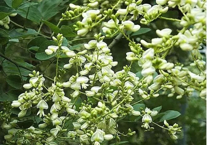 每当秋天来临,槐叶染金,徐风吹过,落叶遍地,S形大街上如铺上了金黄色的地毯。到了晚秋,树上只剩下依稀可见的几片叶子,顽强地与粗暴的冷风抗争。树上裸露出成串的槐恋豆,悬垂在凄风冷雨中,去涅槃一个未来的梦。