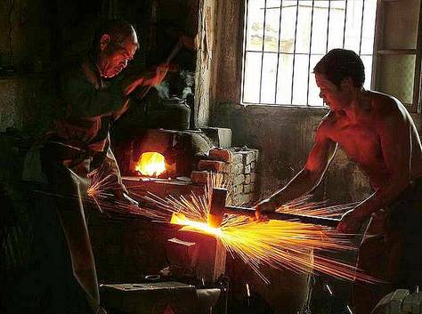 到了盛夏,枝头绽出饱满的蕾(槐米)来,不几日,满树槐米悄然绽放,开出了淡绿色的花。每当清风掠过,满树槐花如细雨般萧萧而下,洋洋洒洒。那烘托着槐米的枝叶借此尽情张扬,在空中连成一片绿色的屏障,槐荫树下便成了人们的天堂。老汉们吸着长长的烟袋,有一句没一句地讲着家长里短;孩子们或骑在树上,或伏在地上,尽情玩耍;大姑娘、小媳妇在树下做着针线,说着悄悄话,不时发出阵阵悦耳的笑声。还有走卖作买的,也依附在大树下有意无意地做着生意。卖杂货的货郎,敲打着懒洋洋的小铜锣。铉顶杆儿的老朱在手中旋转着顶杆儿,显摆着手艺。打铁的老王常常独占中间的槐荫,徒弟光着黝黑油光的膀子把风箱拉得山响。老王手执长长的鸦嘴钳子,在火苗窜出的炉堂内翻动着农具,无聊的人们一边和老王说笑,一边听老王“叮当叮当”的打铁。
