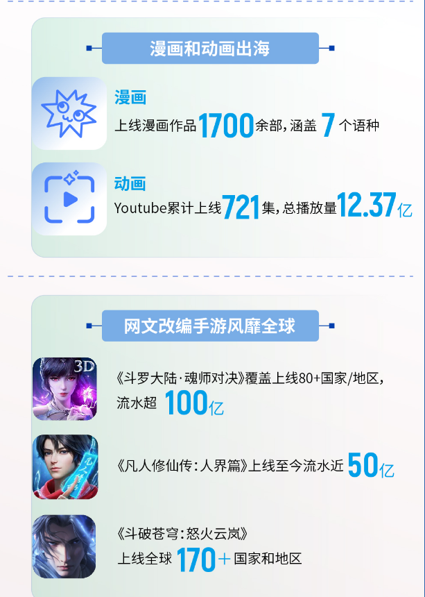 多部作品从小说文本衍生至文化产业多个链条。比如,由网文IP改编的《庆余年第二季》通过迪士尼实现全球同步发行,成为Disney+平台上播放热度最高的中国大陆电视剧;《与凤行》在全球180多个国家与地区播出;网文改编手游风靡全球,其中《斗罗大陆·魂师对决》流水超100亿,《斗破苍穹:怒火云岚》上线全球超170个国家和地区。