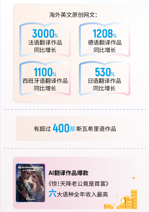 去年9月至今,网络文学在德、法、葡语的翻译出海市场均实现了从零到上百部的突破,累计有超400部斯瓦希里语作品。2025年阅文将继续加码AI技术投入,重点攻坚日、韩、泰等东亚及东南亚语种,全面升级原创扶持计划。