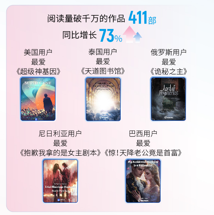 “中国网文太‘卷’了!在这里能找到自己喜欢的各种类型,犹如巨型文化超市,不会厌倦!”有海外网友留言,中国网文题材多样类型多元,满足了不同用户的内容需求。据统计,美国用户爱看《超级神基因》,巴西用户首选《惊!天降老公竟是首富》,俄罗斯用户喜欢看《诡秘之主》,泰国用户侧重《天道图书馆》。