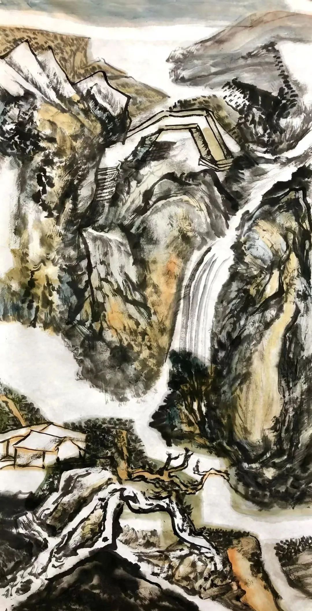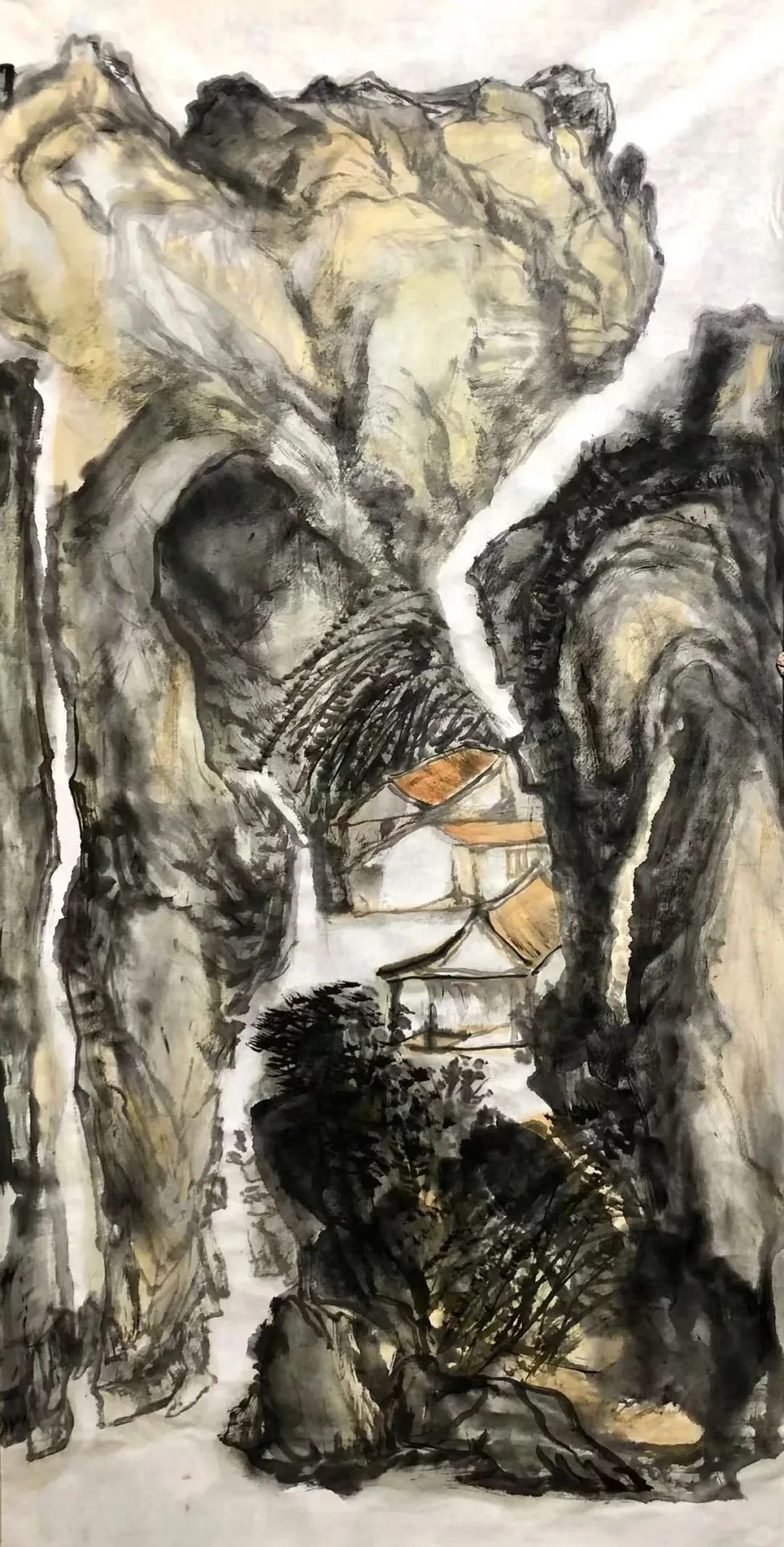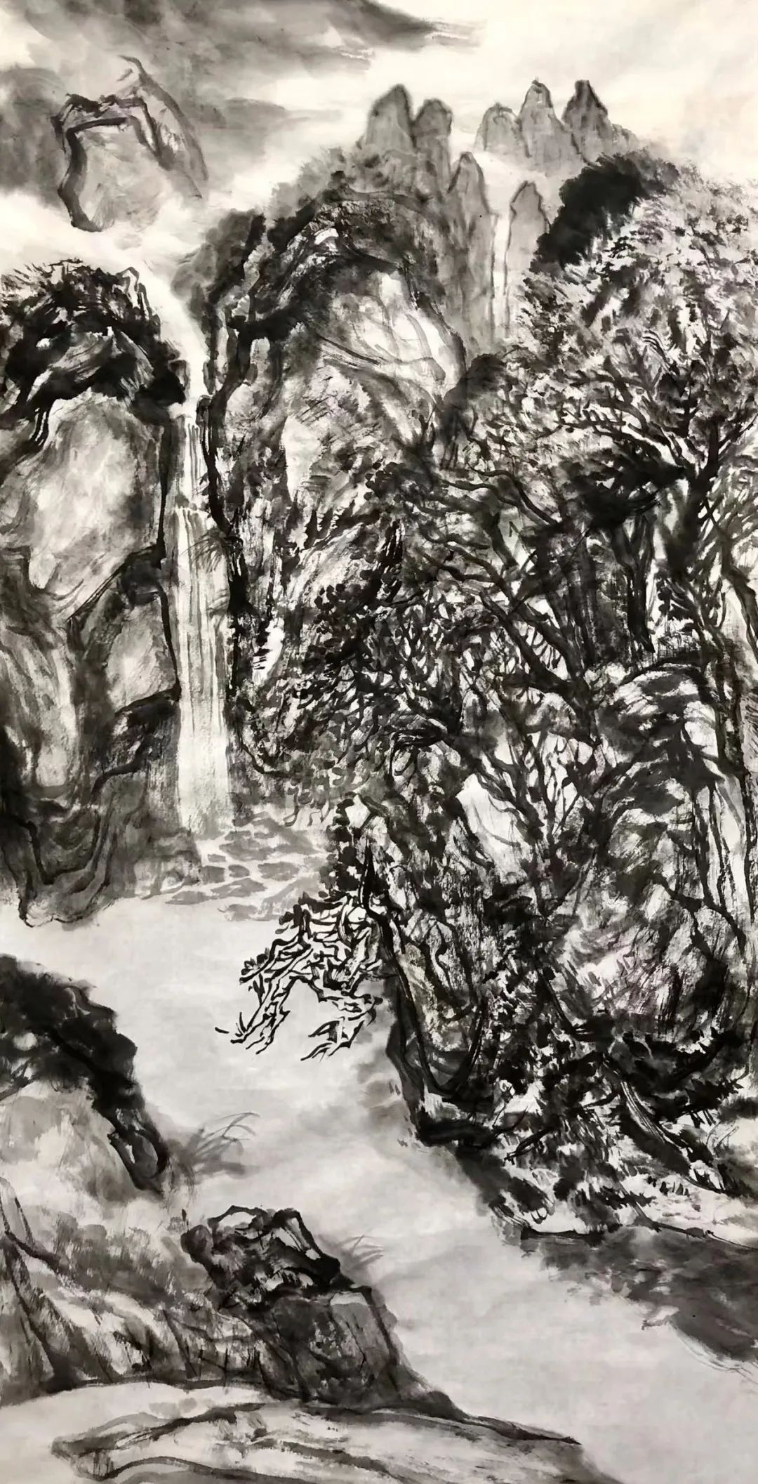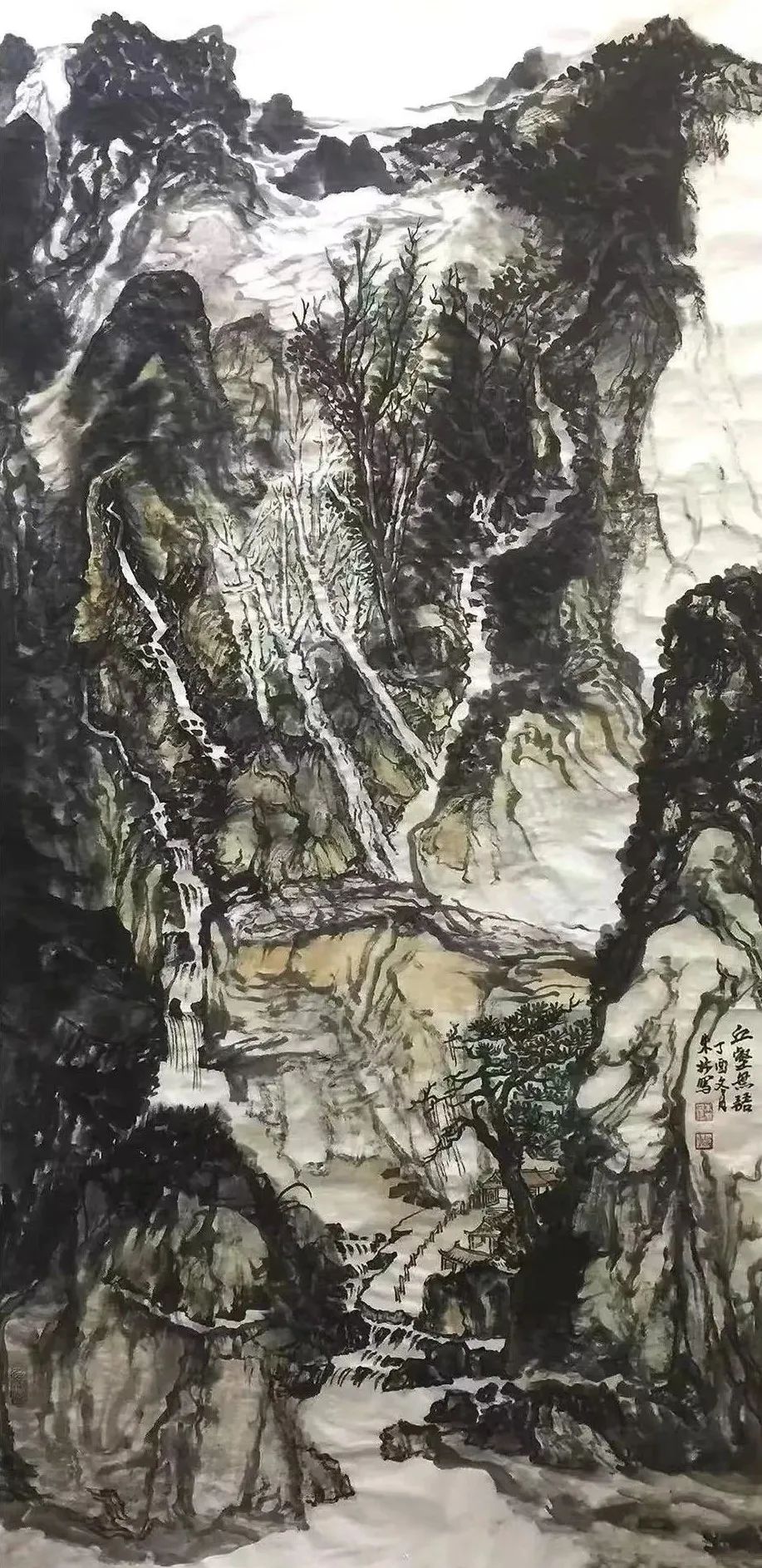 他山水画中之气有二,一是虚中气,二是气。朱林先生画中虚气充盈。他善于从虚处着眼。他的画,虚处散在画面的各个部分,如同血脉,在画面流淌,山石之间,林木之间,无处不有虚。有时画面左右虚,有时是中间虚;有时是物象虚,有时是意境虚,有时虚中还虚。比如,他画远景,淡笔一抹,中间留白,这就是虚中还虚。于是,虚又有了层次和深度。他的虚,有动中虚,有静中虚。白云横卧,他以淡笔画云心,这是静中虚,飞瀑直下,他在瀑中画烟,这是动中虚。画面之虚,以留白营造,实属难事,但虚的高妙,在于以实写之,朱林先生之中国山水画,有时物象厚重密实,但这厚重密实之中却又是尽显空灵,这是他画神奇处之一。