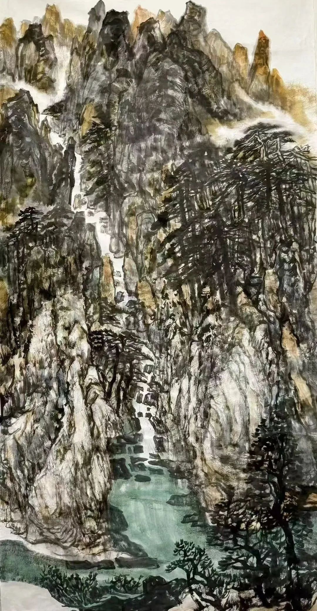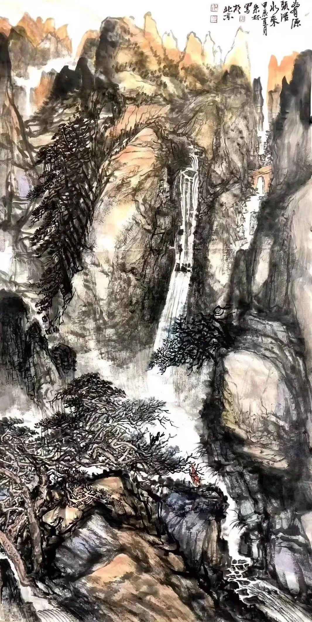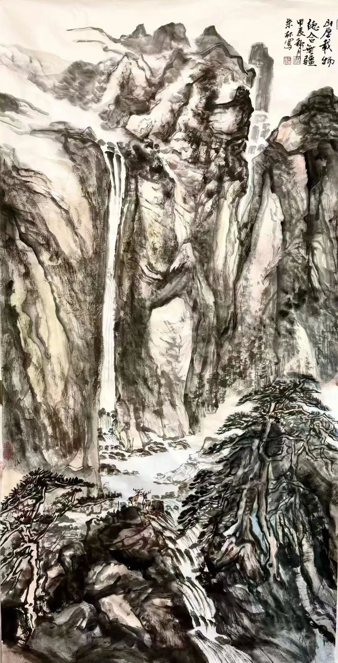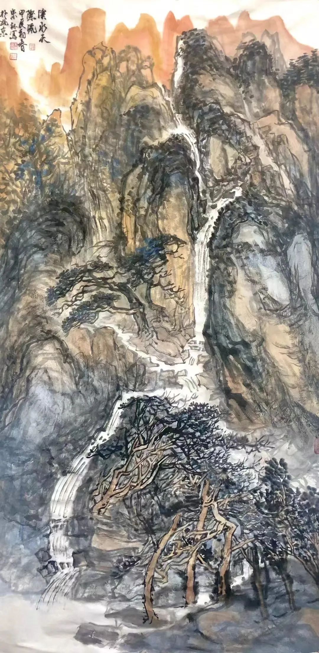 他山水画中之气有二,一是虚中气,二是气。朱林先生画中虚气充盈。他善于从虚处着眼。他的画,虚处散在画面的各个部分,如同血脉,在画面流淌,山石之间,林木之间,无处不有虚。有时画面左右虚,有时是中间虚;有时是物象虚,有时是意境虚,有时虚中还虚。比如,他画远景,淡笔一抹,中间留白,这就是虚中还虚。于是,虚又有了层次和深度。他的虚,有动中虚,有静中虚。白云横卧,他以淡笔画云心,这是静中虚,飞瀑直下,他在瀑中画烟,这是动中虚。画面之虚,以留白营造,实属难事,但虚的高妙,在于以实写之,朱林先生之中国山水画,有时物象厚重密实,但这厚重密实之中却又是尽显空灵,这是他画神奇处之一。