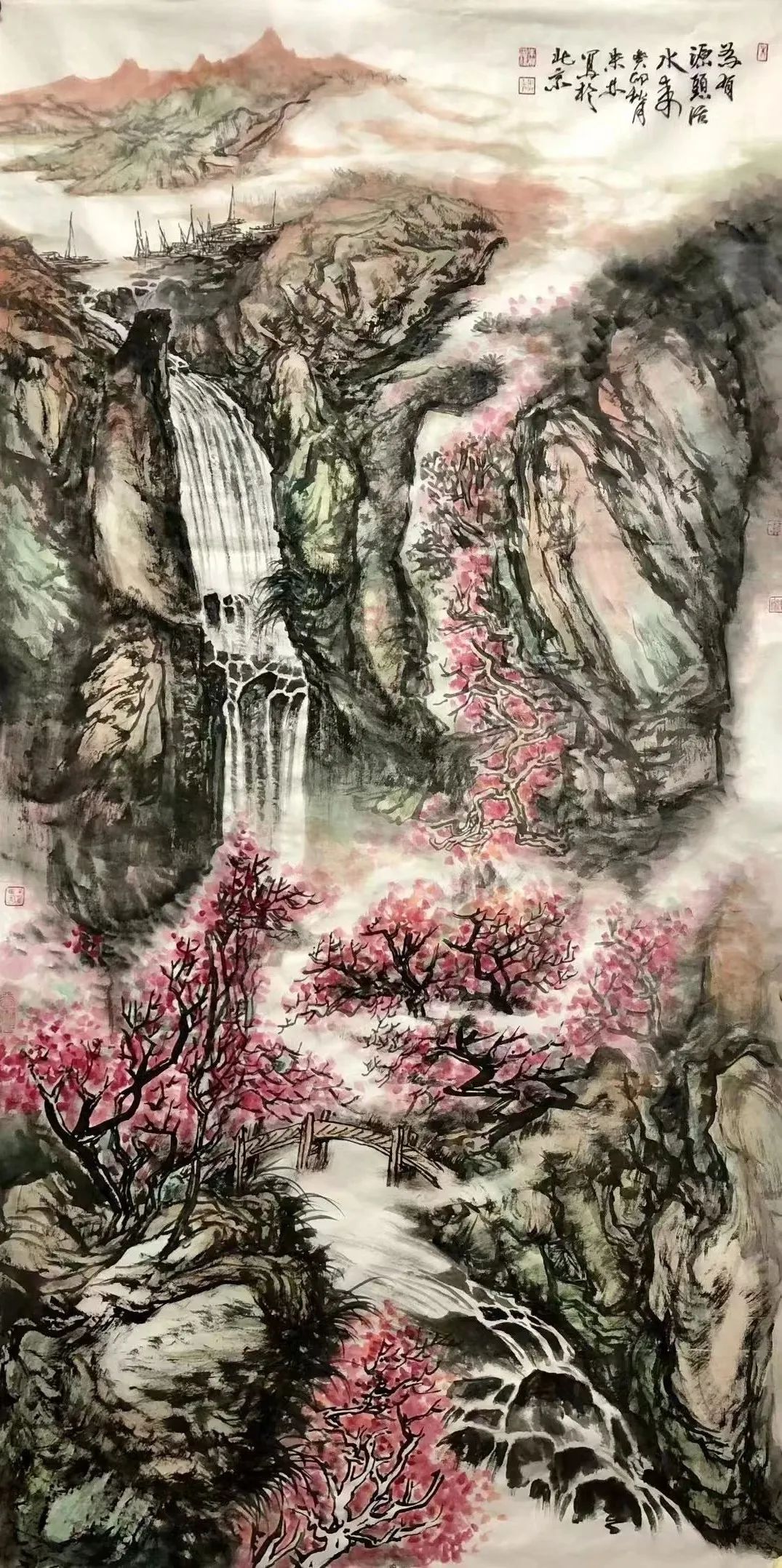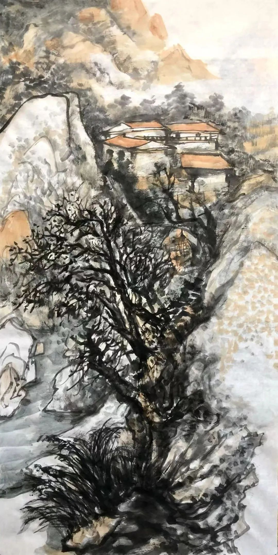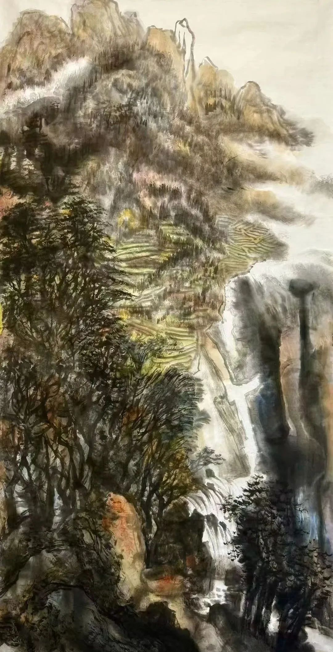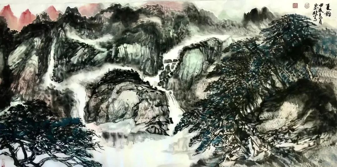 他山水画中之气有二,一是虚中气,二是气。朱林先生画中虚气充盈。他善于从虚处着眼。他的画,虚处散在画面的各个部分,如同血脉,在画面流淌,山石之间,林木之间,无处不有虚。有时画面左右虚,有时是中间虚;有时是物象虚,有时是意境虚,有时虚中还虚。比如,他画远景,淡笔一抹,中间留白,这就是虚中还虚。于是,虚又有了层次和深度。他的虚,有动中虚,有静中虚。白云横卧,他以淡笔画云心,这是静中虚,飞瀑直下,他在瀑中画烟,这是动中虚。画面之虚,以留白营造,实属难事,但虚的高妙,在于以实写之,朱林先生之中国山水画,有时物象厚重密实,但这厚重密实之中却又是尽显空灵,这是他画神奇处之一。